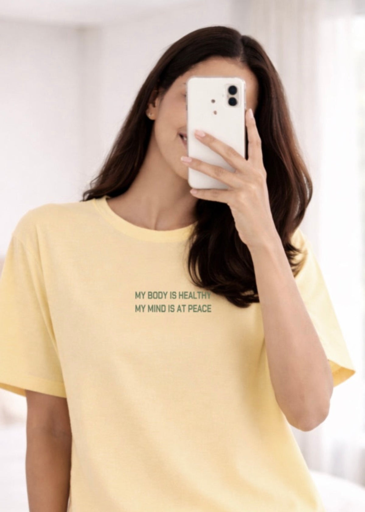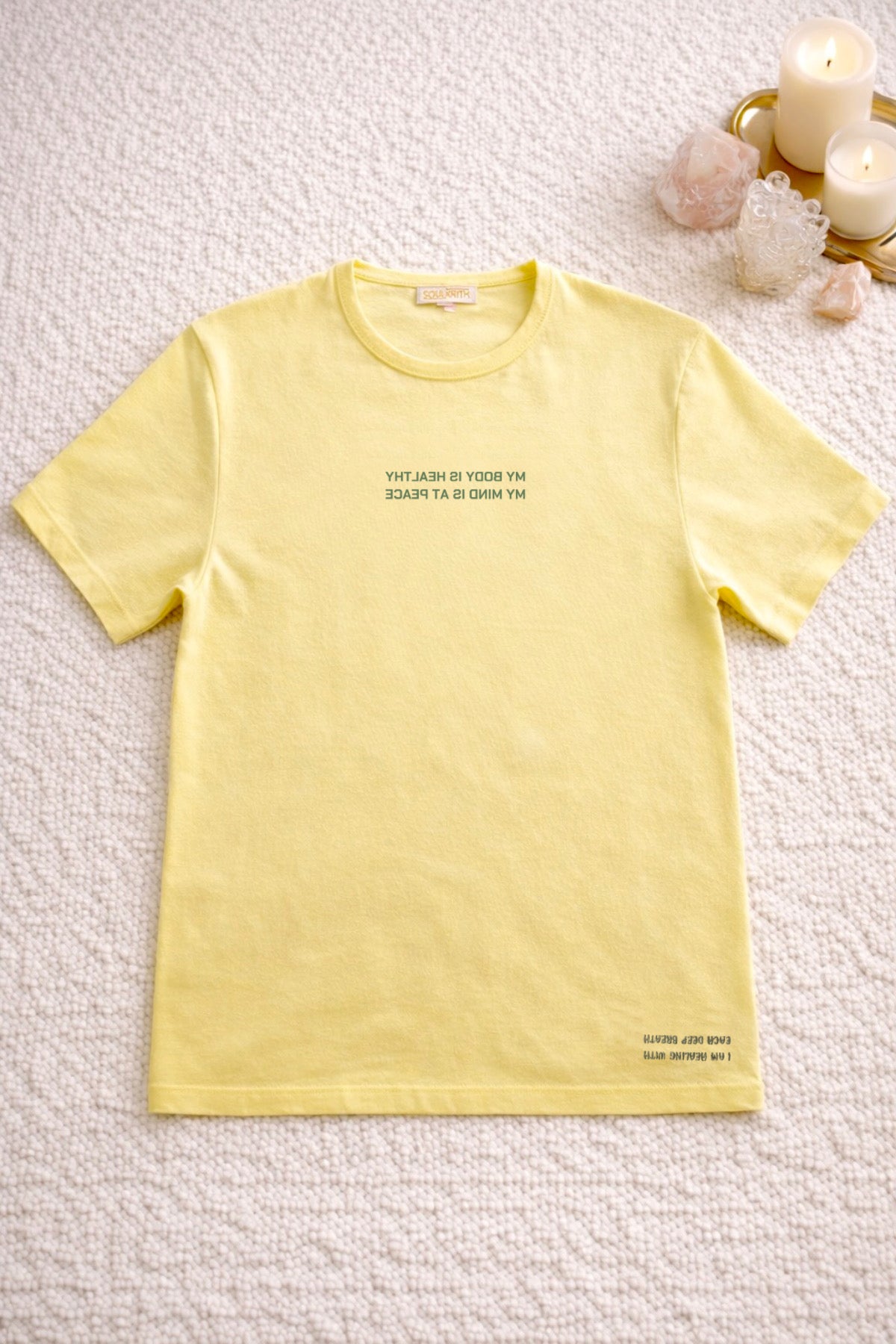 Health Affirmation Set in a soft yellow colour– for natural healing and balance. Text in green connects to physical regeneration.