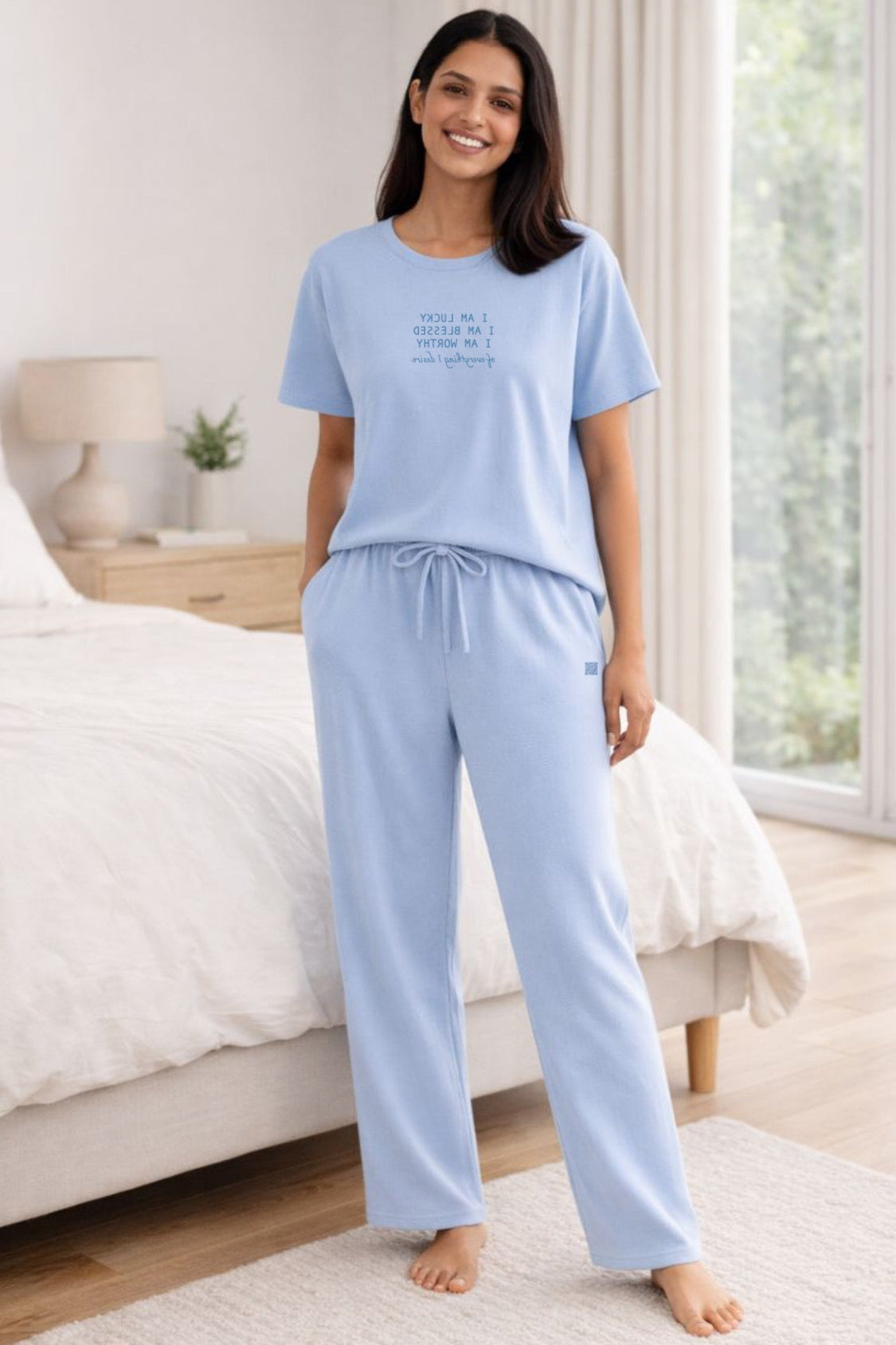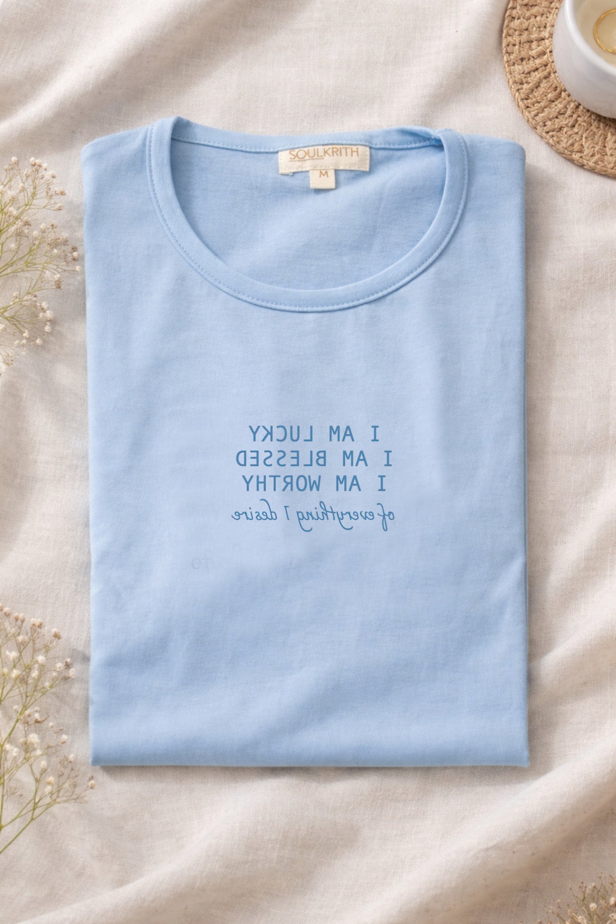 Another affirmation is embroidered/printed on hem, that will reinforce your strengths and keep the brain churning out positive thoughts.